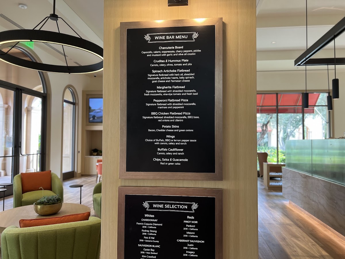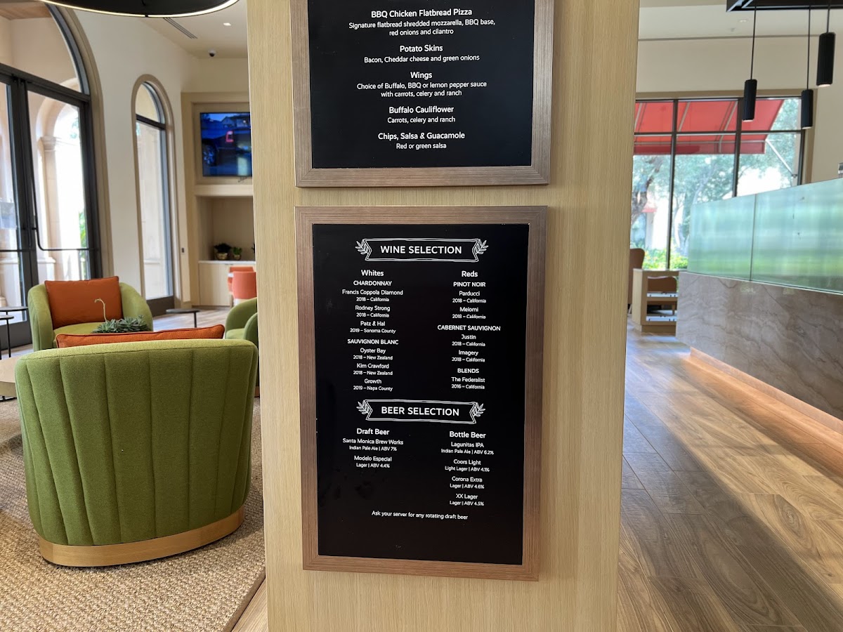 The menu features refreshing cocktails like the Cucumber Cooler and Pomegranate Mojito, complemented by a curated wine and draft beer selection, including Sauvignon Blanc from Oyster Bay and local favorites like Santa Monica Brew Works.